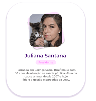 Somos uma organização sem fins lucrativos, dedicada desde 2016 ao acolhimento, proteção e resgate de felinos em situação de abandono, negligência ou maus-tratos, garantindo atendimento veterinário, castração e cuidados essenciais. Nosso trabalho também promove educação e conscientização da população sobre guarda responsável, controle populacional e a importância da adoção. Ao  reduzir o abandono e incentivar práticas responsáveis, contribuímos para o bem-estar animal, para a saúde pública e para uma convivência mais harmoniosa entre pessoas e animais na sociedade.