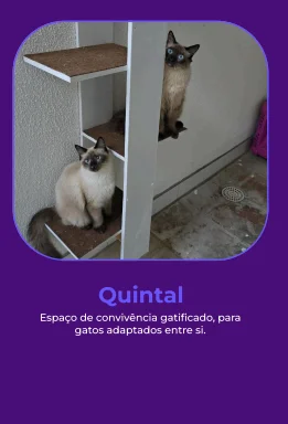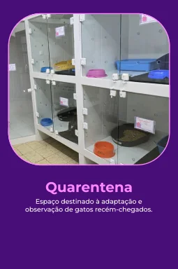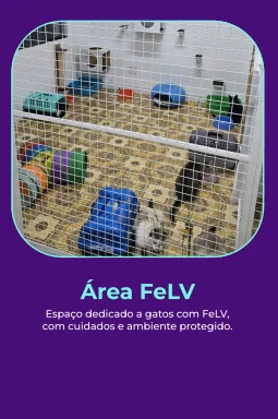 espaço exclusivo para atendimento e recepção de animais resgatados, área de internação de baixa complexidade, duas salas de quarentena e um ambiente separado para gatos positivos para FeLV, respeitando protocolos de saúde e manejo. O espaço também dispõe de um amplo quintal gatificado, com áreas para escalada e